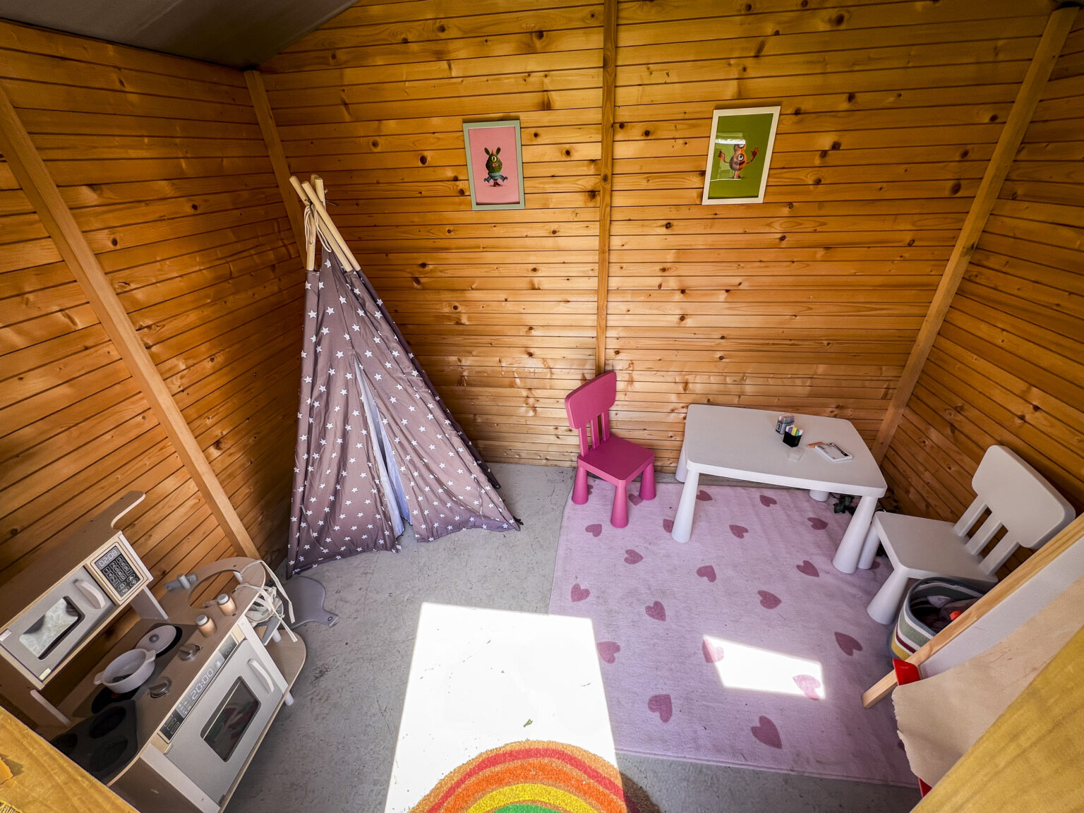 Ha a kertiházat gyermekeink legújabb paradicsomává szeretnénk alakítani, természetesen használhatunk különféle festékeket, sőt! Bevonhatjuk a gyerkőcöket a munkafolyamatba, dekorálásba, kreatív minták, például mesehősök vagy virágok elkészítésébe. Mindemellett azonban tartsuk szem előtt, hogy az alapvetően világos belső tér a festéssel sötétedhet, így szűkítve a teret.