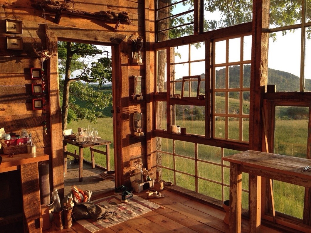 A ház elkészítéséhez különböző bolhapiacokról gyűjtöttek hozzá jó néhány ablakszárnyat és ablakot, illetve berendezési tárgyakat, bútorokat. Az ablakok mindegyike egy darabka történelem. Nincs közöttük két egyforma és a származásukat tekintve is több vidékről származnak. Az egyterű kabint vintage stílusban rendezték be és még egy kis tűzhelyet beépítettek a házikóba.